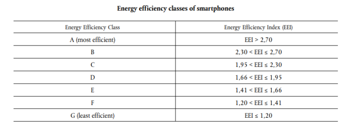 据了解智能手机的能效等级,根据能效指数(EEI)的大小可以划分为 A、B、C、D、E、F、G 七个等级,能效等级最高的为A,最低的为G。