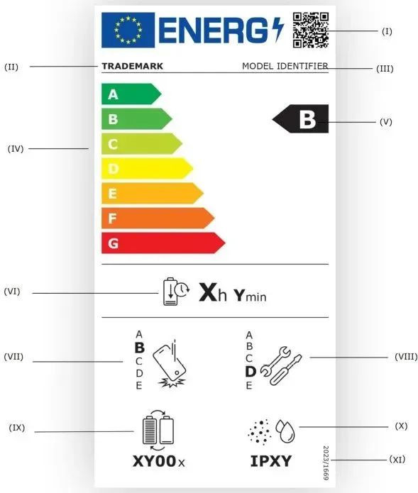 欧盟的手机能效标识,不仅仅是标出能效等级,还有电池续航能力、抗摔性等级、可维修性等级、电池循环寿命以及防水防尘等级。